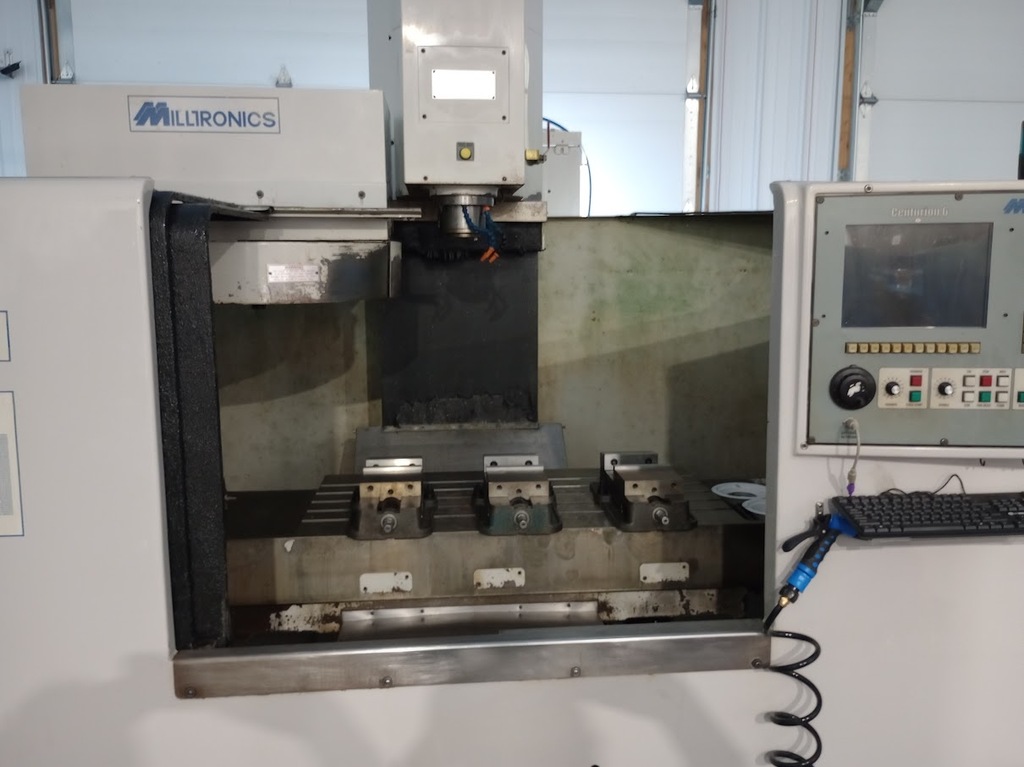 This mill has a capacity of 40 inch on the X-axis and 20 inches on the Y-axis. It use the Centurion 6 control with a 20 station tool changer.